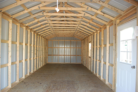 Wall studs are 24 inch on center, and DOUBLED under siding seams. This feature gives our buildings the same strength as 16 inch on center walls, but increases the seal of our buildings.